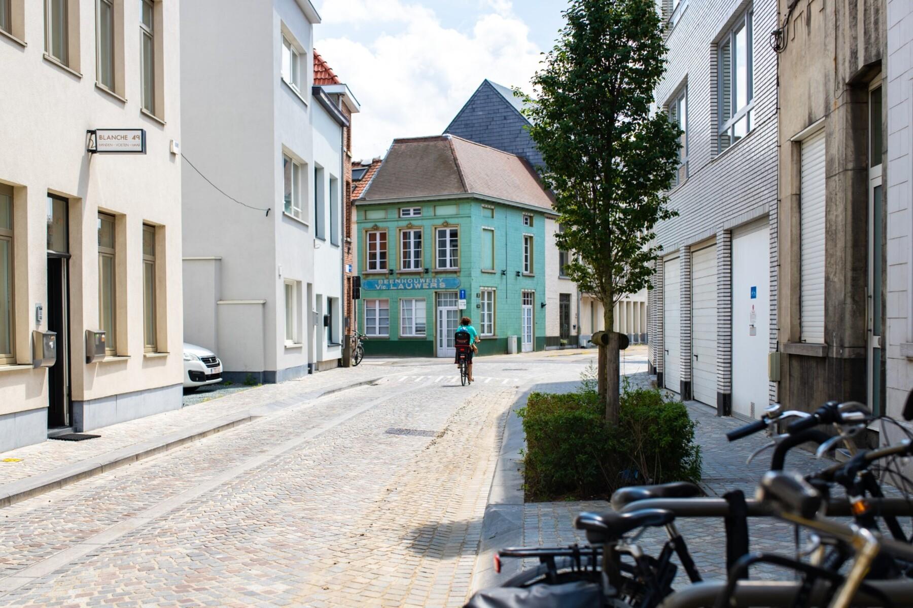 Fietsers fietsen mee op de rijweg. Voor de fietsers in tegenrichting kwam er een fietssuggestiestrook. Door de hoge parkeerdruk zochten we naar een goed evenwicht tussen parkeren, fietsenstallingen en straatgroen.